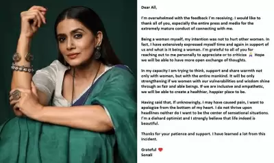 उन्होंने अपने नोट में लिखा: सोनाली ने बयान जारी करते हुए लिखा कि मुझे मिल रही टिप्पणियों से मैं अभिभूत हूं। मैं आप सभी को और विशेष रूप से पूरे प्रेस और मीडिया को मुझसे जुड़ने के लिए धन्यवाद देना चाहती हूं। खुद एक महिला होने के नाते मेरा इरादा दूसरी महिलाओं को ठेस पहुंचाने का नहीं था। वास्तव में मैंने महिलाओं के समर्थन में बार-बार खुद को बड़े पैमाने पर व्यक्त किया है और यह एक महिला होने के नाते किया है।