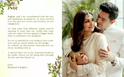 सगाई के दो दिन बाद, परिणीति ने सोमवार को इंस्टाग्राम पर लिखा, राघव और मैं पिछले कुछ हफ्तों में मिले प्यार और पॉजिटिविटी से बहुत खुश हैं, खासकर हमारी सगाई पर।