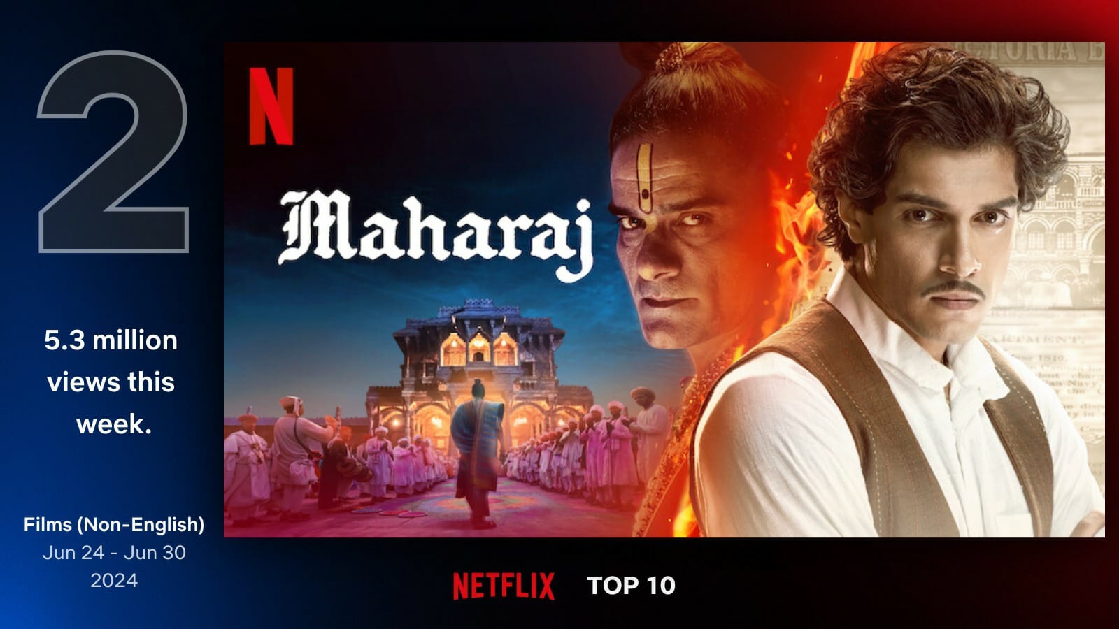 इस उपलब्धि के बाद, फिल्म ने तेजी से नेटफ्लिक्स की नॉन-इंग्लिश टॉप टेन लिस्ट में नंबर दो की पायदान पर जगह बना ली। 1862 के महाराज लिबेल केस पर आधारित इस फिल्म ने अपनी सम्मोहक कथा और बेहतरीन प्रदर्शन के लिए दर्शकों के साथ गहरी छाप छोड़ी है, इस अद्भुत सहयोग की ताकत को प्रदर्शित किया है 'महाराज' नेटफ्लिक्स पर विशेष रूप से स्ट्रीमिंग हो रहा है!