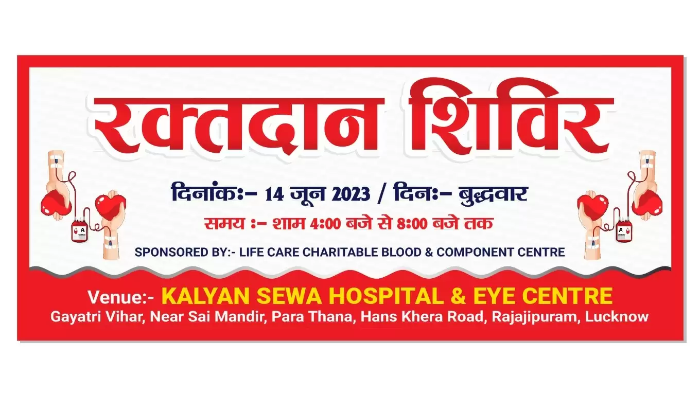 14 जून बुधवार को कल्याण सेवा हॉस्पिटल एंड आई सेंटर में रक्तदान शिविर का आयोजन किया जा रहा है