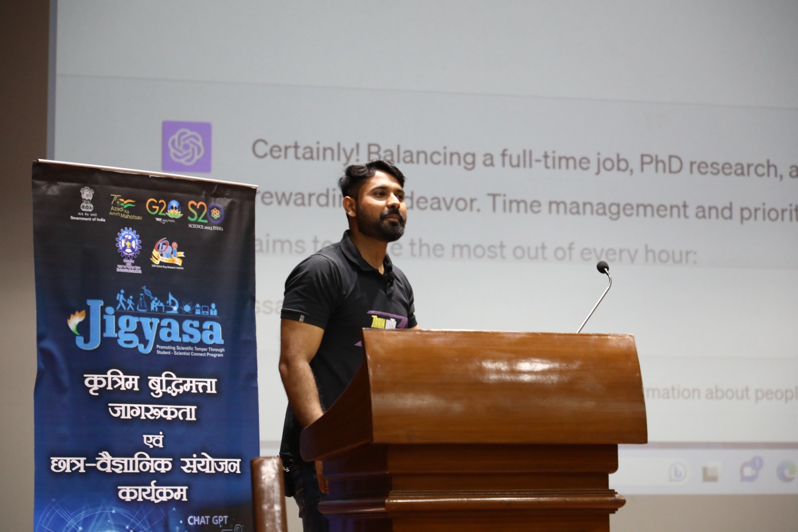 उन्होंने आर्टिफिशियल इंटेलिजेंस को लेकर आमजन में फैली भ्रामकता एवं संदेह, कि एआई कि वजह से लोगों कि नौकरियां चली जाएंगी को बेहद तर्कसंगत तरीके से दूर करने का प्रयास किया। कुछ हैंड्स-ऑन टूल का प्रदर्शन करते हुए उन्होने बताया कि कैसे एआई कम समय मे किसी प्रोजेक्ट को तैयार करने में एक बेहद मूल्यवान उपकरण सहायक सिद्ध हो सकता है। आर्टिफिशियल इंटेलिजेंस से हम कम समय मे कई काम कर सकते है। उन्होंने अनेक मुफ्त एवं सुरक्षित एआई टूल की एक श्रृंखला के बारे में भी जानकारी प्रदान कि जिनके माध्यम से अनेक कठिन कामों को आसानी से कम समय में पूरा किया जा सकता है।