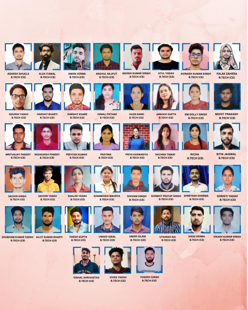 Dr. Himanshu Pandey, the Training and Placement Cell In-Charge, reported that during the campus placement drive, 43 B.Tech Civil Engineering students were selected by Ambuja Cement with an annual package of 3.12 lakh INR. The selected students include Adarsh Shukla, Alex Itawal, Aman Verma, Anshul Rajput, Ashish Kumar Singh, Atul Yadav, Avinash Kumar Singh, Falak Zehra, Gourav Yadav, Harshit Bharti, Harshit Khare, Himali Pathak, Husn Bano, Jahnvi Gupta, Kumari Dolly Singh, Mohit Prakash, Mrityunjay Pandey, Niskarsh Pandey, Peeyush Kumar, Pratima, Priya Karwariya, Rachna Tiwari, Richa, Ritik Jaiswal, Sachin Singh, Sachin Yadav, Shalini Yadav, Shambhavi Maurya, Shivam Singh, Shobhit Pratap Singh, Shreyas Sharma, Srishti Yadav, Shubham Kumar Yadav, Sujit Kumar Bharti, Tikesh Gupta, Umaid Iqbal, Umar Islam, Utkarsh Rai, Vikas Verma, Vikas Kumar Singh, Vishal Srivastava, Vivek Yadav, and Yogesh Singh.