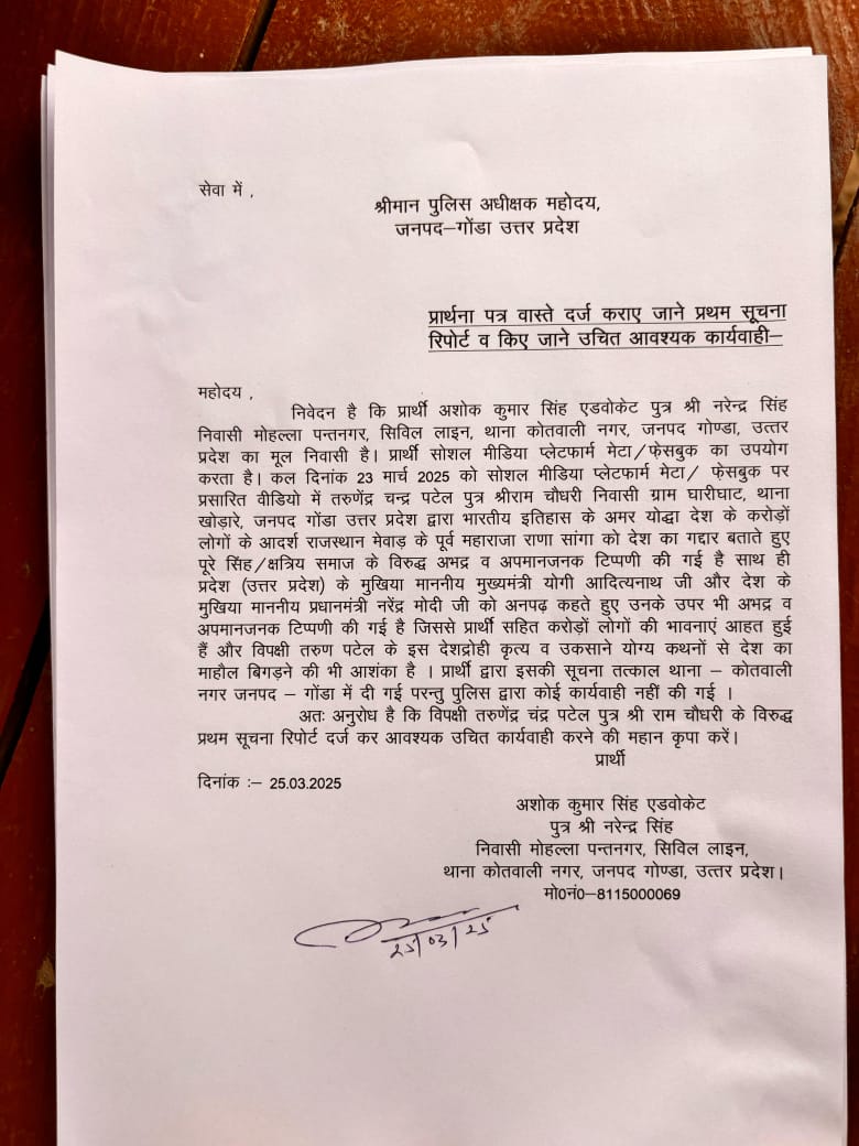 महोदय, - निवेदन है कि प्रार्थी अशोक कुमार सिंह एडवोकेट पुत्र श्री नरेन्द्र सिंह निवासी मोहल्ला पन्तनगर, सिविल लाइन, थाना कोतवाली नगर, जनपद गोण्डा, उत्तर प्रदेश का मूल निवासी है। प्रार्थी सोशल मीडिया प्लेटफार्म मेटा /फेसबुक का उपयोग करता है। कल दिनांक 23 मार्च 2025 को सोशल मीडिया प्लेटफार्म मेटा / फेसबुक पर प्रसारित वीडियो में तरुणेंद्र चन्द्र पटेल पुत्र श्रीराम चौधरी निवासी ग्राम घारीघाट, थाना खोड़ारे, जनपद गोंडा उत्तर प्रदेश द्वारा भारतीय इतिहास के अमर योद्धा देश के करोड़ों लोगों के आदर्श राजस्थान मेवाड़ के पूर्व महाराजा राणा सांगा को देश का गद्दार बताते हुए पूरे सिंह/क्षत्रिय समाज के विरुद्ध अभद्र व अपमानजनक टिप्पणी की गई है साथ ही प्रदेश (उत्तर प्रदेश) के मुखिया माननीय मुख्यमंत्री योगी आदित्यनाथ जी और देश के मुखिया माननीय प्रधानमंत्री नरेंद्र मोदी जी को अनपढ़ कहते हुए उनके उपर भी अभद्र व अपमानजनक टिप्पणी की गई है जिससे प्रार्थी सहित करोड़ों लोगों की भावनाएं आहत हुई हैं और विपक्षी तरुण पटेल के इस देशद्रोही कृत्य व उकसाने योग्य कथनों से देश का माहौल बिगड़ने की भी आशंका है। प्रार्थी द्वारा इसकी सूचना तत्काल थाना कोतवाली नगर जनपद- गोंडा में दी गई परन्तु पुलिस द्वारा कोई कार्यवाही नहीं की गई । अतः अनुरोध है कि विपक्षी तरुणेंद्र चंद्र पटेल पुत्र श्री राम चौधरी के विरुद्ध प्रथम सूचना रिपोर्ट दर्ज कर आवश्यक उचित कार्यवाही करने की महान कृपा करें।