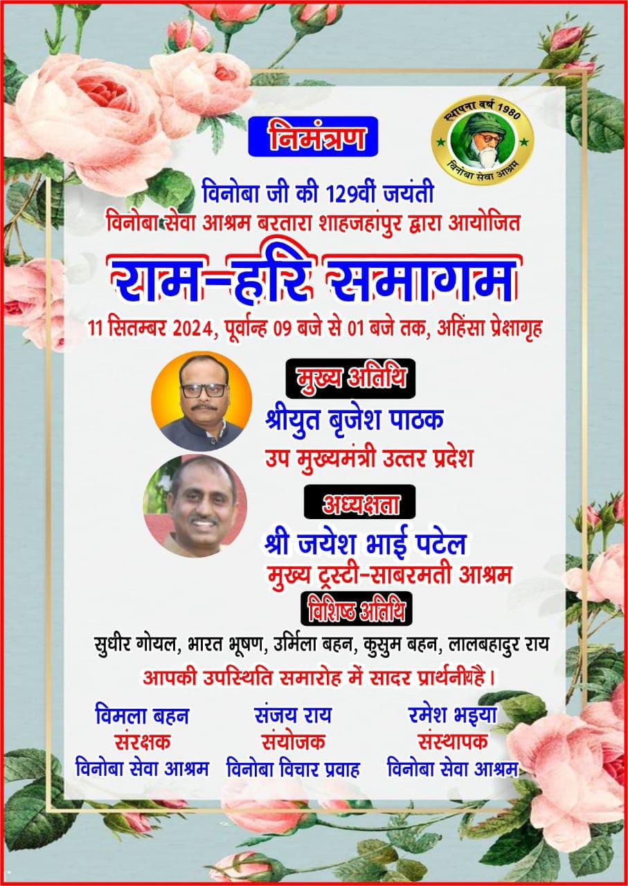 उत्तर प्रदेश डेस्क लखनऊ (आर एल पाण्डेय)। राष्ट्रपिता महात्मां गांधी के अध्यात्मिक उत्तराधिकारी आचार्य विनोबा भावे की 129 वीं जन्म जयंती पर विनोबा सेवा आश्रम जयंती कार्यकम निम्नवत आयोजित कर रहा हैं-