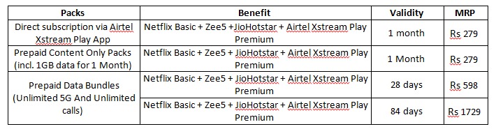 Airtel का नया OTT प्रीपेड पैक सिर्फ ₹279 की शुरुआती कीमत पर उपलब्ध है, जिसकी वैधता 1 महीने की है। इस सिंगल पैक में उपयोगकर्ताओं को ₹750 तक की लोकप्रिय स्ट्रीमिंग सेवाओं तक पहुंच मिलती है, जिसमें शामिल हैं: