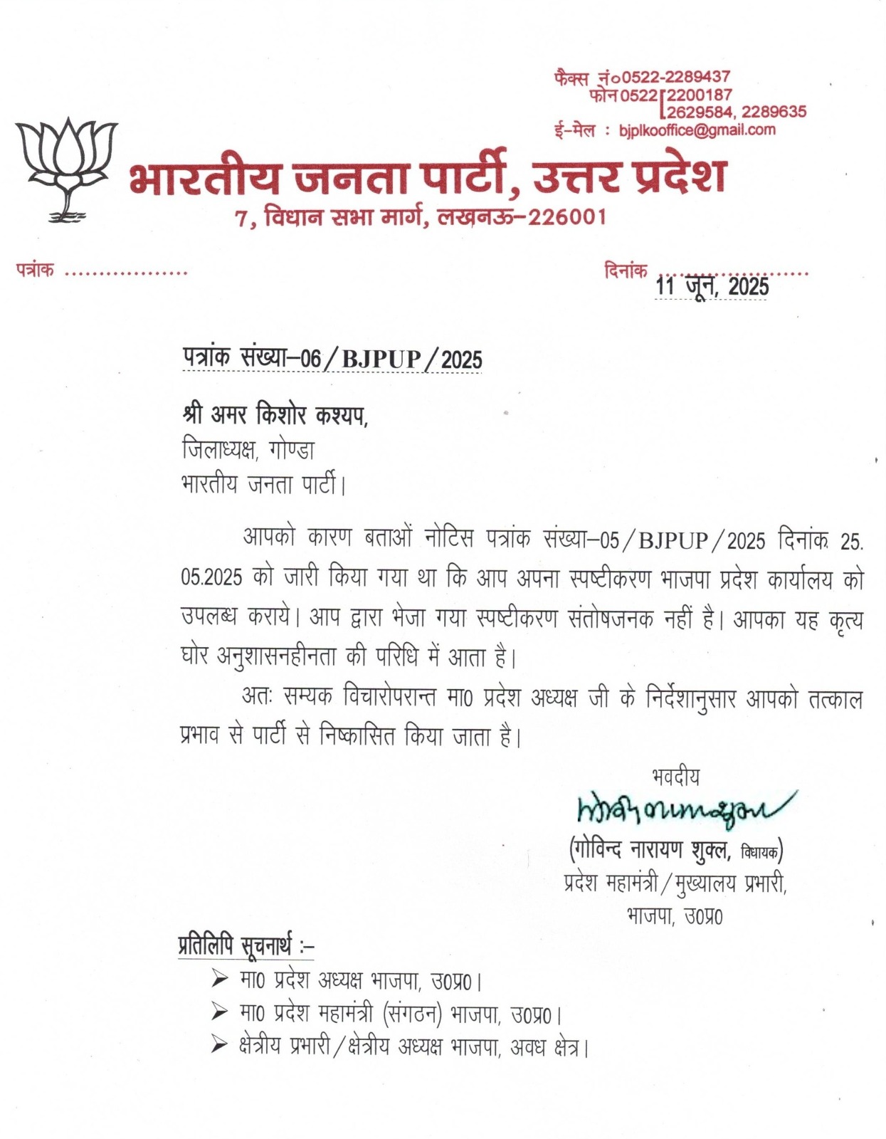 भाजपा जिलाध्यक्ष बर्खास्त पार्टी से भी निष्कासित