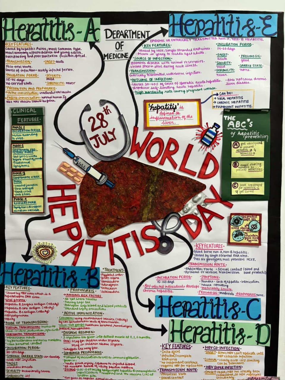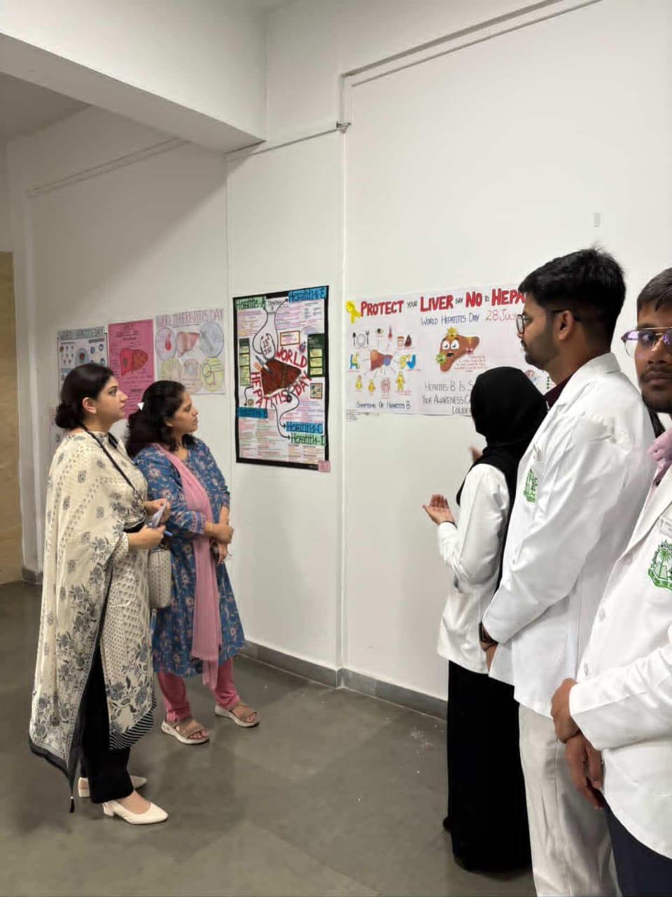 The event saw enthusiastic participation from MBBS students, who created awareness posters and presented thematic skits focused on hepatitis transmission, symptoms, and treatment strategies. A quiz competition for postgraduate students also served as a platform to reinforce medical knowledge and foster peer learning. Dr. Nida and Dr. Hemali coordinated the entire program, ensuring smooth execution and high engagement levels throughout the day.