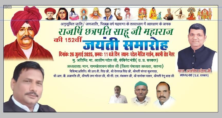 मैहर, 21 जुलाई 2025 – ओबीसी, एससी/एसटी महासभा के तत्वावधान में सामाजिक न्याय और आरक्षण के अग्रदूत राजर्षि छत्रपति साहू जी महाराज की 152वीं जयंती का भव्य आयोजन 26 जुलाई 2025, शनिवार को पटेल मैरिज गार्डन, कटनी रोड, मैहर (जिला सतना) में सुबह 11 बजे से किया जाएगा।