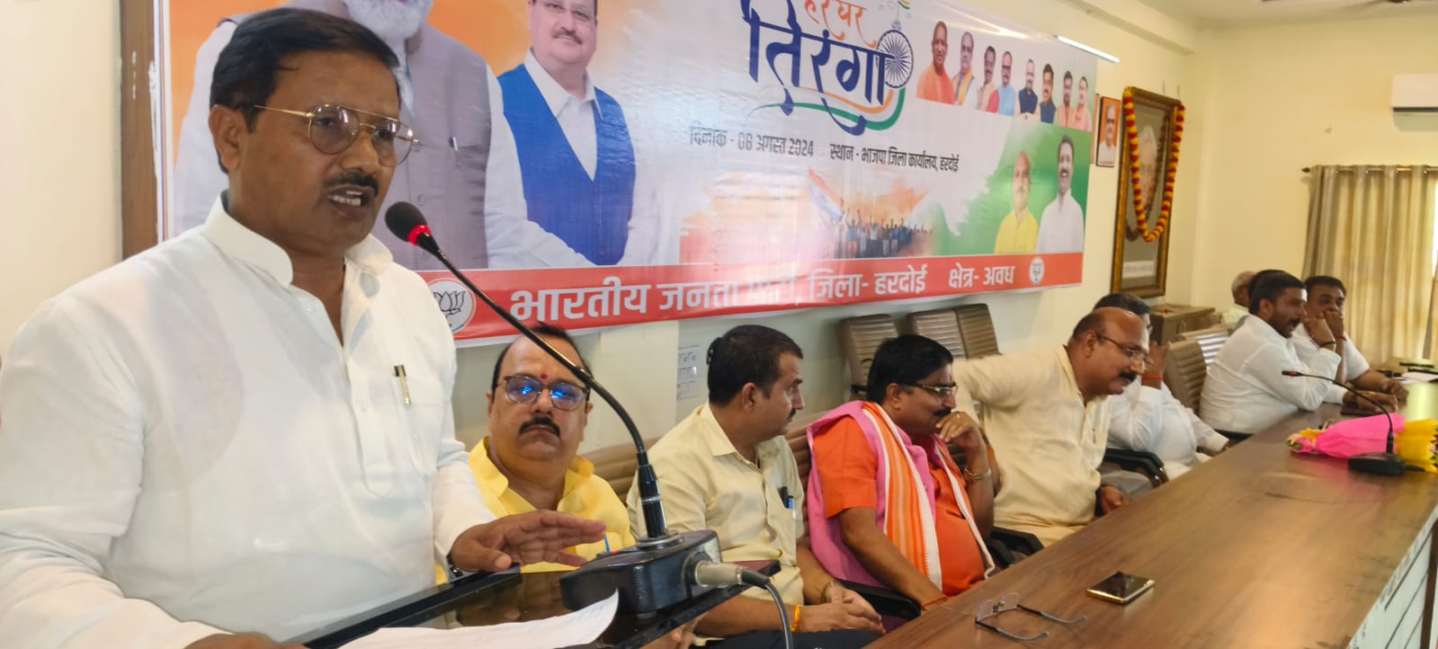 हरदोई(अंबरीष कुमार सक्सेना) भारतीय जनता पार्टी कार्यालय पर हर घर तिरंगा यात्रा कार्यक्रम पर संपन्न हुई प्रेस वार्ता में जिलाध्यक्ष अजीत सिंह बब्बन एवं जिला प्रभारी शंकर लाल लोधी ने १५ अगस्त से पूर्व होने वाले पार्टी कार्यक्रमों को साझा किया।