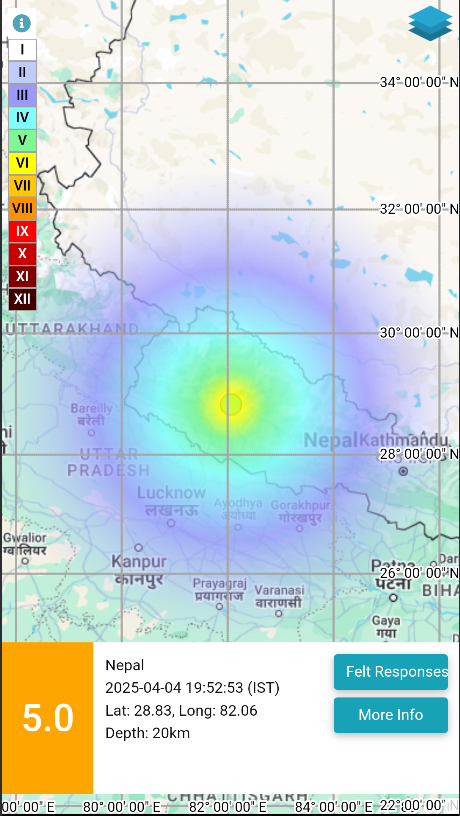 EQ of M: 5.0, On: 04/04/2025 19:52:53 IST, Lat: 28.83 N, Long: 82.06 E, Depth: 20 Km, Location: Nepal.