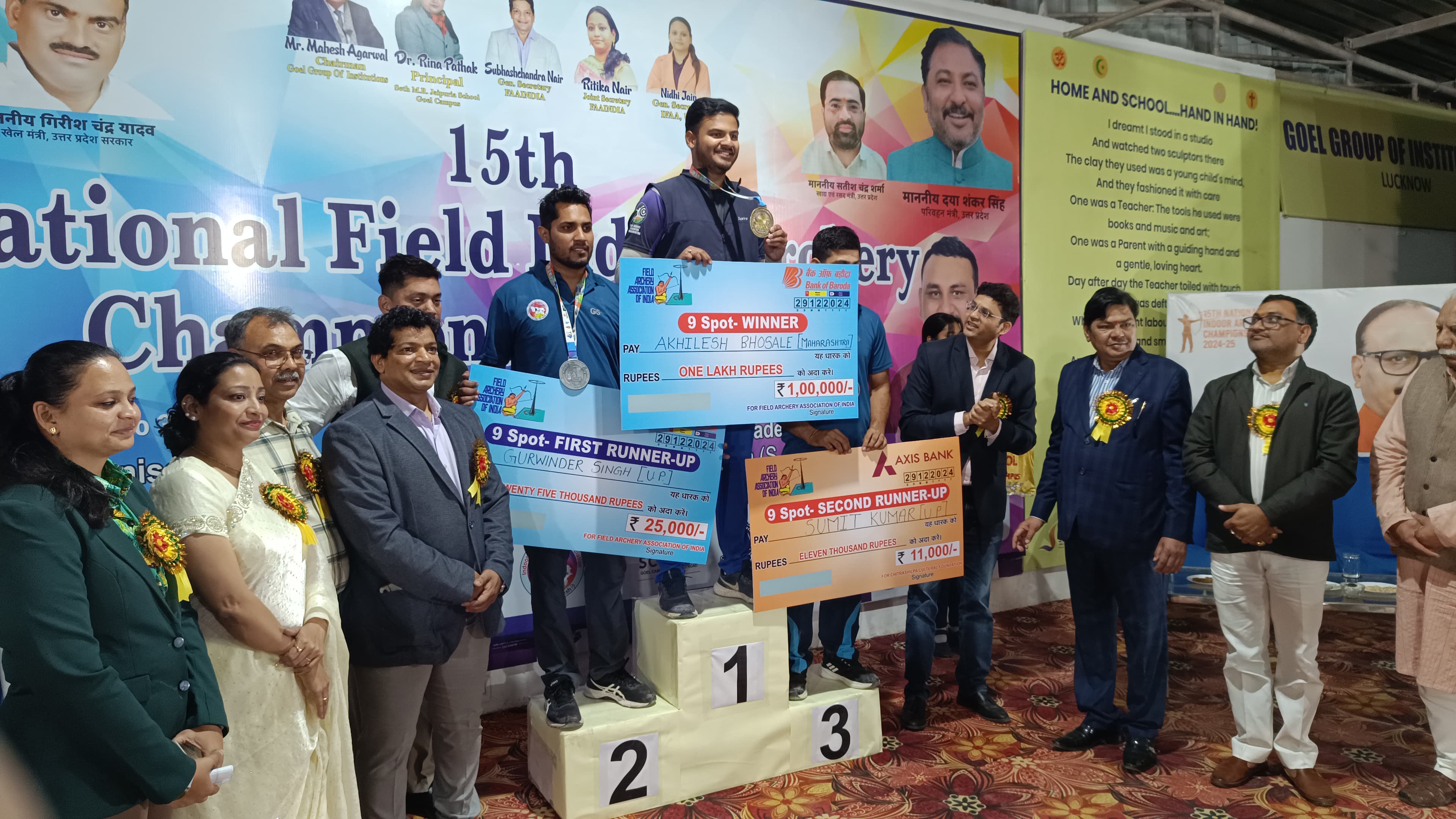 गोयल ग्रुप ऑफ इंस्टीट्यूशंस के चेयरमैन महेश अग्रवाल एवं प्रधानाचार्या डॉ. रीना पाठक के द्वारा विजयी प्रतियोगियों को प्रमाणपत्र के अलावा नकद धनराशि प्रदान की गई। कुल ९ स्पॉट नॉक राउंड रहे ,अखिलेश भोंसले ( महाराष्ट्र)को एक लाख, गुरविंदर सिंह (यूपी ) को २५ हज़ार, सुमित कुमार ( यूपी) को ११ हज़ार की नकद धनराशि प्रदान की गई l।