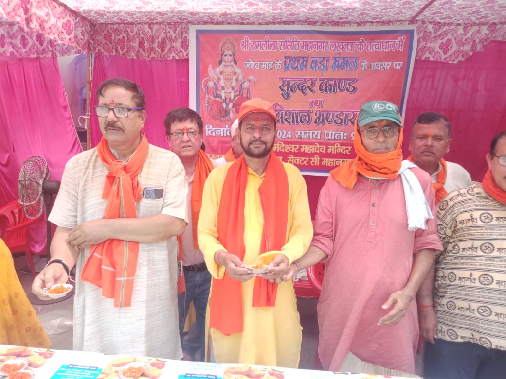उत्तर प्रदेश डेस्क लखनऊ ( आर एल पांडेय)। श्री रामलीला समिति महानगर लखनऊ के संयोजन में रामलीला मैदान महानगर में ज्येष्ठ के प्रथम मंगलवार को विशाल भंडारे का आयोजन किया गया जिसमें राजधानी के हजारों लोगों ने प्रसाद ग्रहण किया। इस अवसर पर सर्वप्रथम सुंदरकांड का पाठ तत्पश्चात आरती की गई और प्रसाद वितरण का शुभारंभ हुआ।भंडारा देर शाम तक चलता रहा।