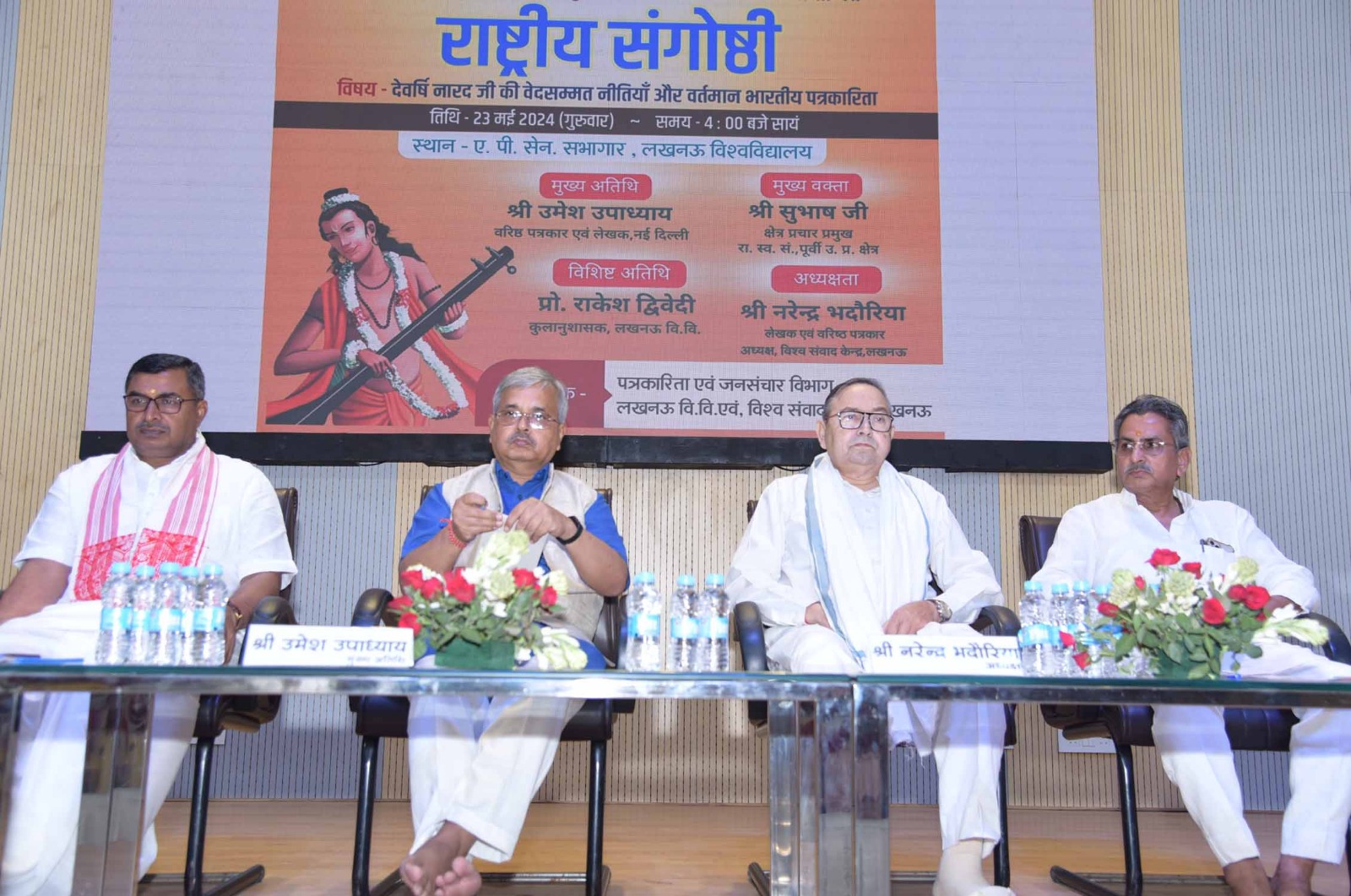 राष्ट्रीय संगोष्ठी की प्रस्तावना को आरंभ करते हुए राष्ट्रीय स्वयंसेवक संघ के अवध प्रान्त के प्रांत प्रचार प्रमुख डॉ. अशोक दुबे ने कहा कि देवर्षि नारद जी के संचार के विविध सोपानो के माध्यम से हम जानते हैं। देवर्षि नारद ने हमेशा लोकमंगल की पत्रकारिता की। डॉ. दुबे ने बताया की पत्रकारिता शब्द भारत का नहीं है बल्कि भारत में तो भौतिक समृद्धि के साथ साथ आध्यात्मिकता अधिष्ठान पर भी बल दिया गया है। हमारे यहां सामाजिक कार्यों में कार्य करते हुए विशेष पूजन होता है। पत्रकारिता के क्षेत्र में देवर्षि नारद हमारी संस्कृति में पूजनीय है। हजारों वर्षों के इतिहास काल में हमारे यहां विभिन्न संघर्षों के साथ अपने विचारो पर अडिग रहे। पत्रकारिता जगत में समाचार का विशेष योगदान है। राष्ट्रीय संगोष्ठी को संबोधित करते हुए मुख्य वक्ता राष्ट्रीय स्वयंसेवक संघ के पूर्वी उत्तर प्रदेश क्षेत्र के क्षेत्र प्रचार प्रमुख और मुख्य वक्ता सुभाष जी ने संगोष्ठी को संबोधित करते हुए कहा कि देवर्षि नारद भगवान के मन है, विद्वान है और संचारक है।