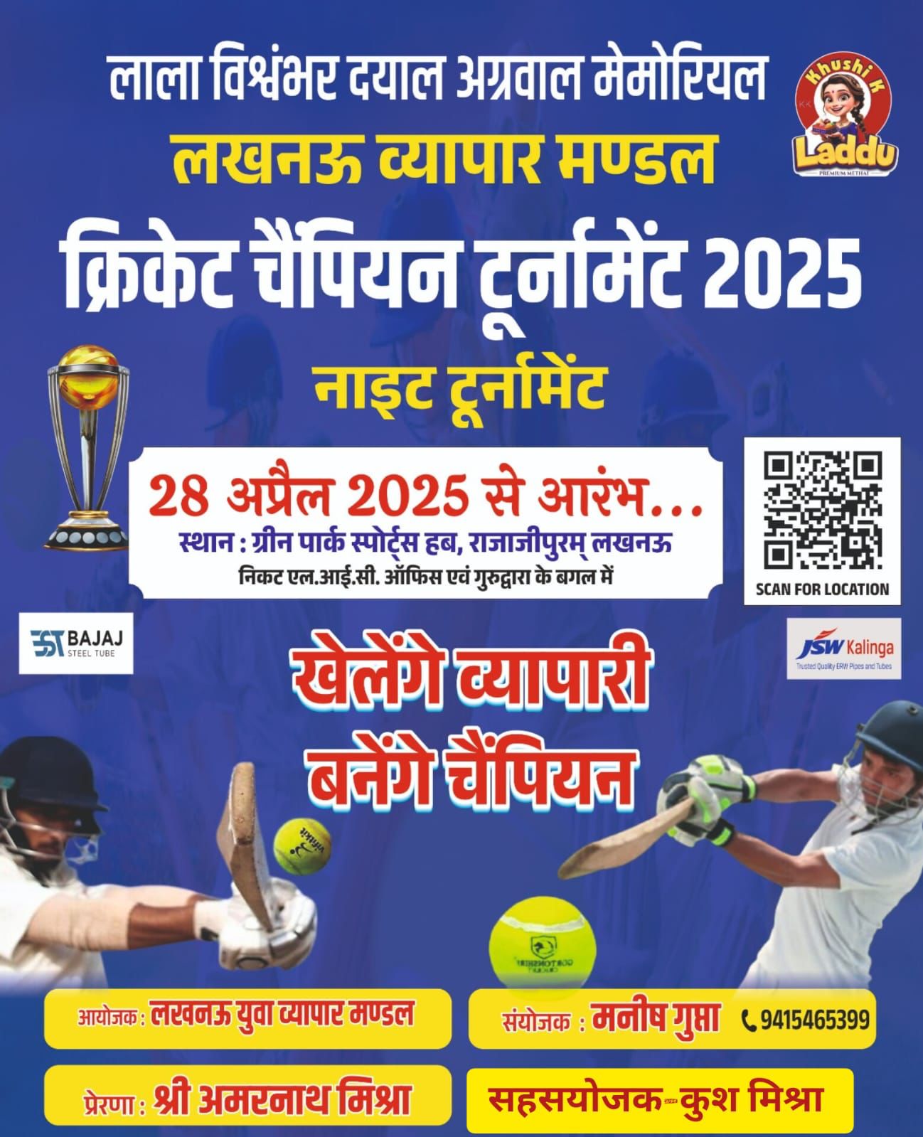 टूनामेन्ट के आयोजक लखनऊ व्यापार मण्डल के युवा अध्यक्ष मनीष गुप्ता ने कार्यक्रम की जानकारी देते हुए बताया कि लखनऊ व्यापार मण्डल से सम्बद्ध नगर इकायी व्यापार मण्डलों की 16टीमों के द्वारा मैच खेले जायेंगे जोकि रात्रि 8बजे से 10 एवं 10से 12 बजे तक दो मैच प्रतिदिन होंगे जो कि फाइनल मैच 7मई 2025 को खेला जायेगा। आज पहल मैच बुलाकी अड्डा मार्केट से लखनऊ लोहा व्यापार मण्डल की टीम खेलेगी। दूसरा मैच यहियागंज रन मशीन से कैंट युवा व्यापार मण्डल खेलागा।