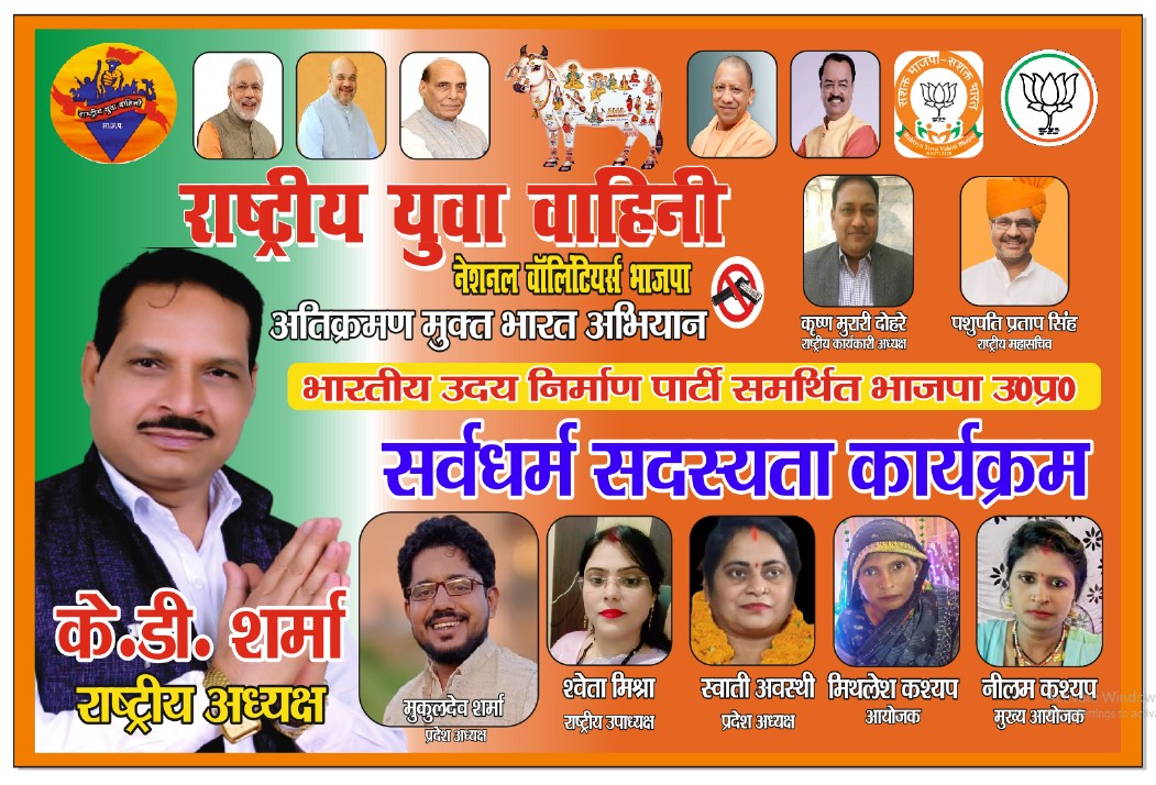सीतापुर/लखनऊ डेस्क (प्रत्यूष पाण्डेय)। राष्ट्रीय युवा वाहिनी नेशनल वॉलिंटियर्स भाजपा द्वारा बिसवां महमूदाबाद रोड मोच काल चौराहा ग्राम व पोस्ट राजा करनाई में संगठन का सर्वधर्म सदस्यता अभियान कार्यक्रम आयोजित किया गया, कार्यक्रम में संगठन के राष्ट्रीय प्रमुख महासचिव पशुपत प्रताप सिंह, के साथ-साथ राष्ट्रीय उपाध्यक्ष श्वेता मिश्रा महिला मोर्चा, प्रदेश अध्यक्ष मुकुल देव शर्मा, के साथ साथ स्वाति अवस्थी प्रदेश अध्यक्ष उत्तर प्रदेश महिला मोर्चा, आदि पदाधिकारी उपस्थित रहेंगे।