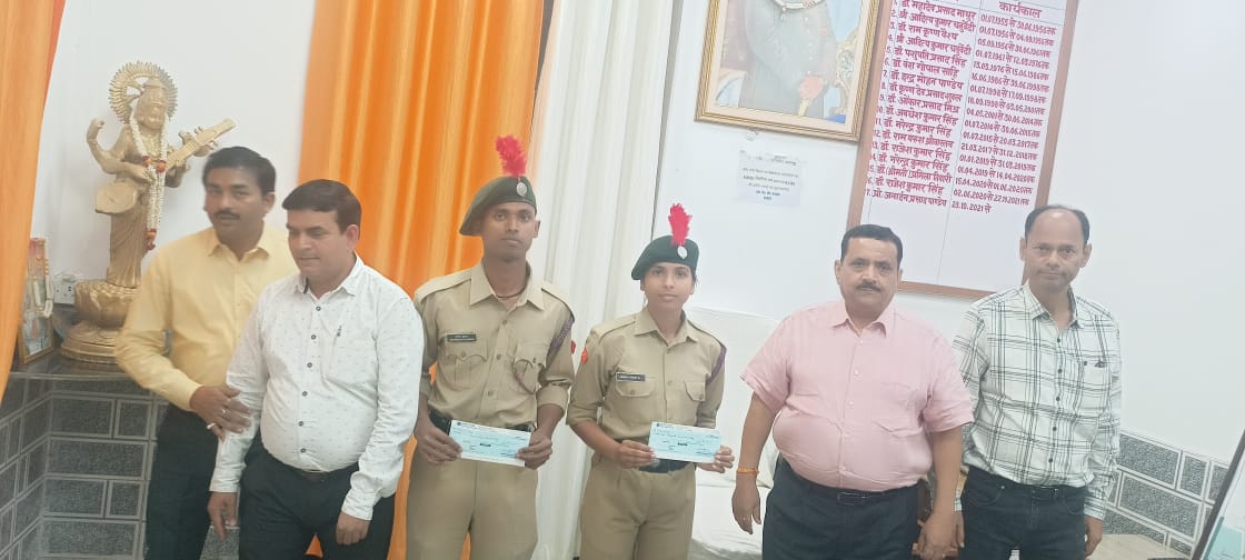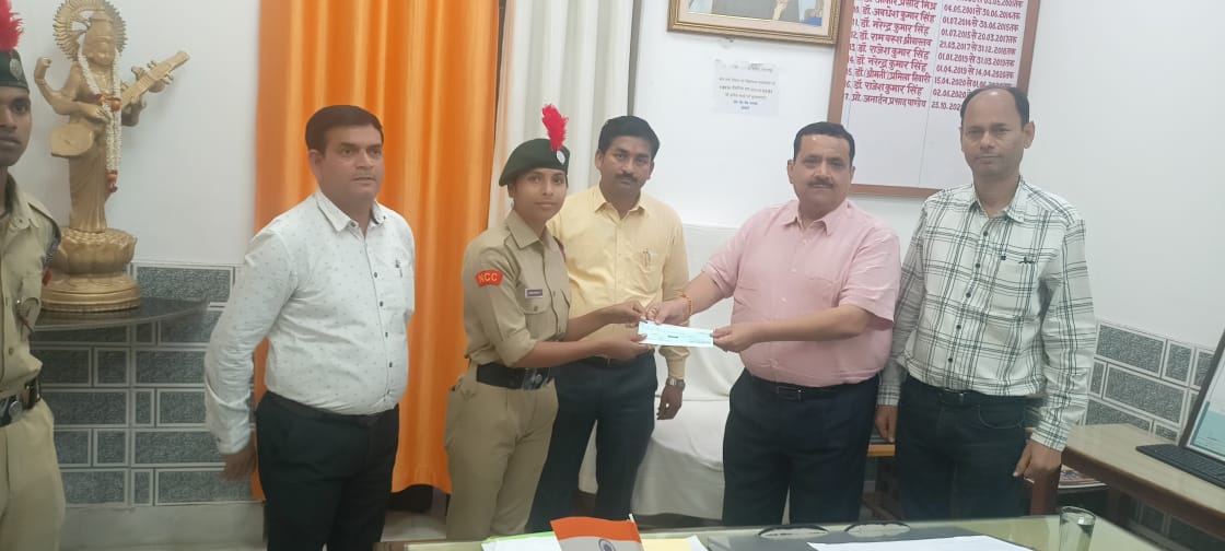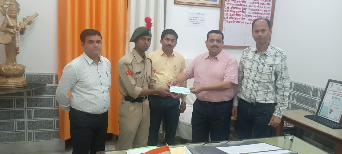 बटालियन द्वारा दुर्गेश को 2400 रुपये व शिखा को 1200 रूपये का चेक उपलब्ध कराया गया। प्रभारी प्राचार्य प्रो0 अरविंद कुमार द्विवेदी ने दोनों कैडेटों को चेक प्रदान करते हुए उनके प्रदर्शन की सराहना की । उन्होंने दोनों कैडेटों के उत्कृष्ट कार्य की सराहना भी की। एसोसिएट एन सी सी ऑफिसर लेफ्टिनेंट डॉ चौहान ने बधाई देते हुए उनके उज्ज्वल भविष्य की कामना की। उन्होंने कहा कि अन्य कैडेटों को भी इनसे प्रेरणा लेते हुए अपना उत्कृष्ट प्रदर्शन करना चाहिए।