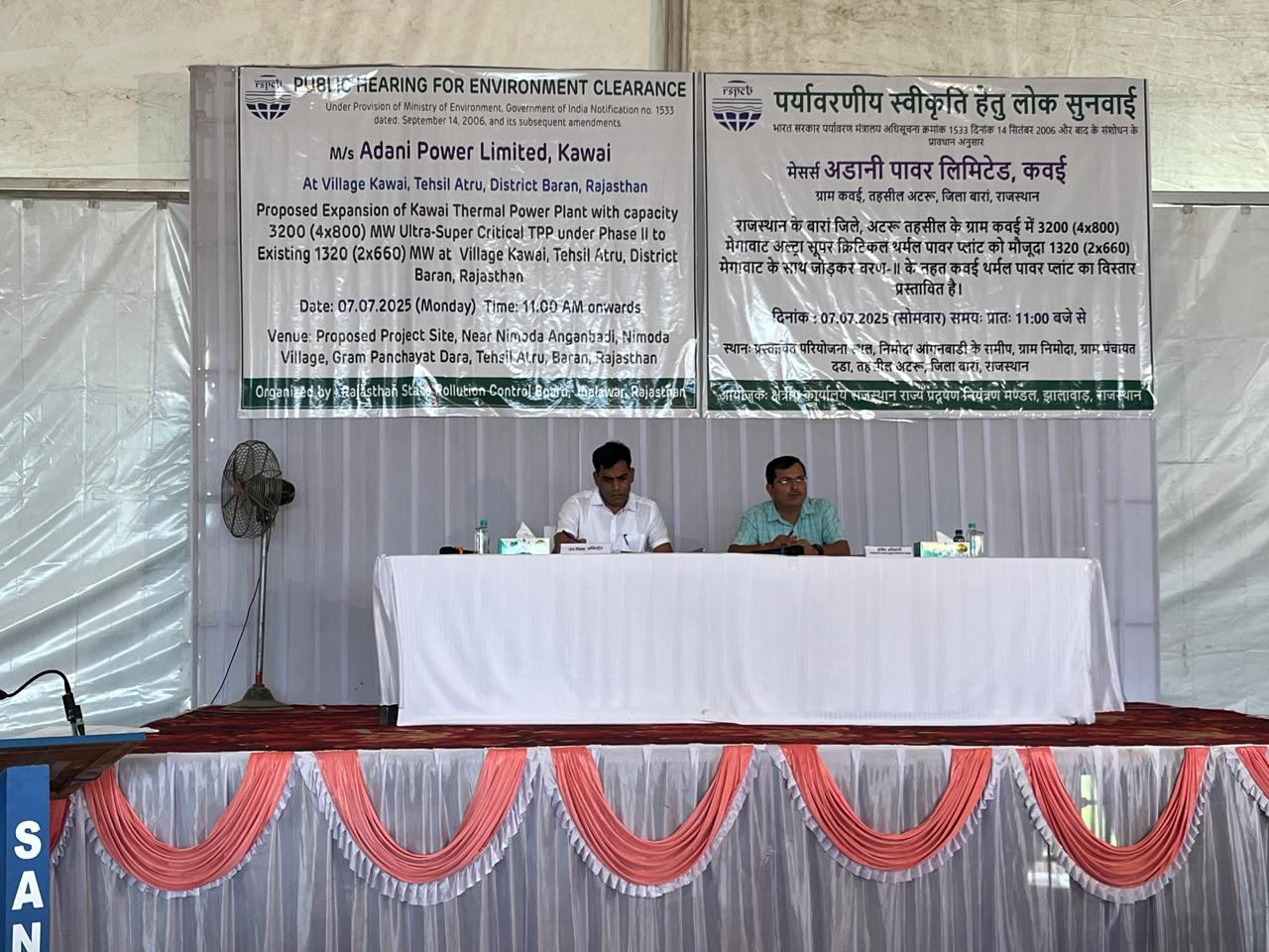 कवाई (अटरू), 7 जुलाई 2025: बारां जिले की अटरू तहसील स्थित ग्राम कवाई में सोमवार को प्रस्तावित 3200 मेगावाट (4x800) अल्ट्रा सुपर क्रिटिकल थर्मल पावर प्लांट के विस्तार को लेकर जनसुनवाई का आयोजन सफलता पूर्वक संपन्न हुआ। यह सुनवाई पर्यावरण मंत्रालय, भारत सरकार की 14 सितंबर 2006 की अधिसूचना व उसके संशोधनों के अंतर्गत पर्यावरणीय स्वीकृति हेतु आयोजित की गई थी। इस प्रस्ताव के तहत अदाणी पॉवर लिमिटेड द्वारा पहले से संचालित 1320 मेगावाट (2x660) संयंत्र की क्षमता में वृद्धि की जाएगी।