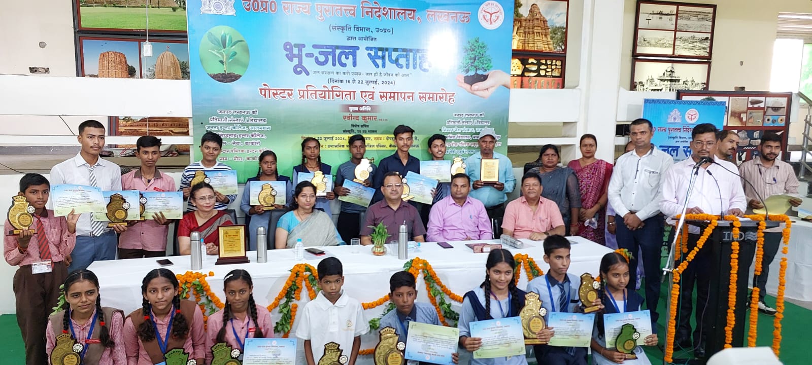दिनांक 16 से 22 जुलाई तक आयोजित विभिन्न प्रतियोगिताओ जिसमें लगभग 07 विद्यालयों एवं दो संस्थानों के 1000 विद्यार्थियों ने चित्रकला, पोस्टर, प्रश्नोत्तरी, व्याख्यान, स्मारक भ्रमण एवं पौधारोपण में प्रतिभाग लिया। उक्त प्रतियोगिता के विजेताओं को क्रमश: प्रथम, द्वितीय, तृतीय पुरस्कार स्वरूप स्मृति चिन्ह एवं प्रमाण पत्र का वितरण कार्यक्रम के मुख्य अतिथि रविंद्र कुमार आईएएस., विशेष सचिव, संस्कृति विभाग ने किया। कार्यक्रम में लोगो को सम्बोधित करते हुए कहा कि हमें यह नहीं भूलना चाहिए कि जल-संकट का समाधान जल के संरक्षण से ही है। हम हमेशा से सुनते आये हैं “जल ही जीवन है”।