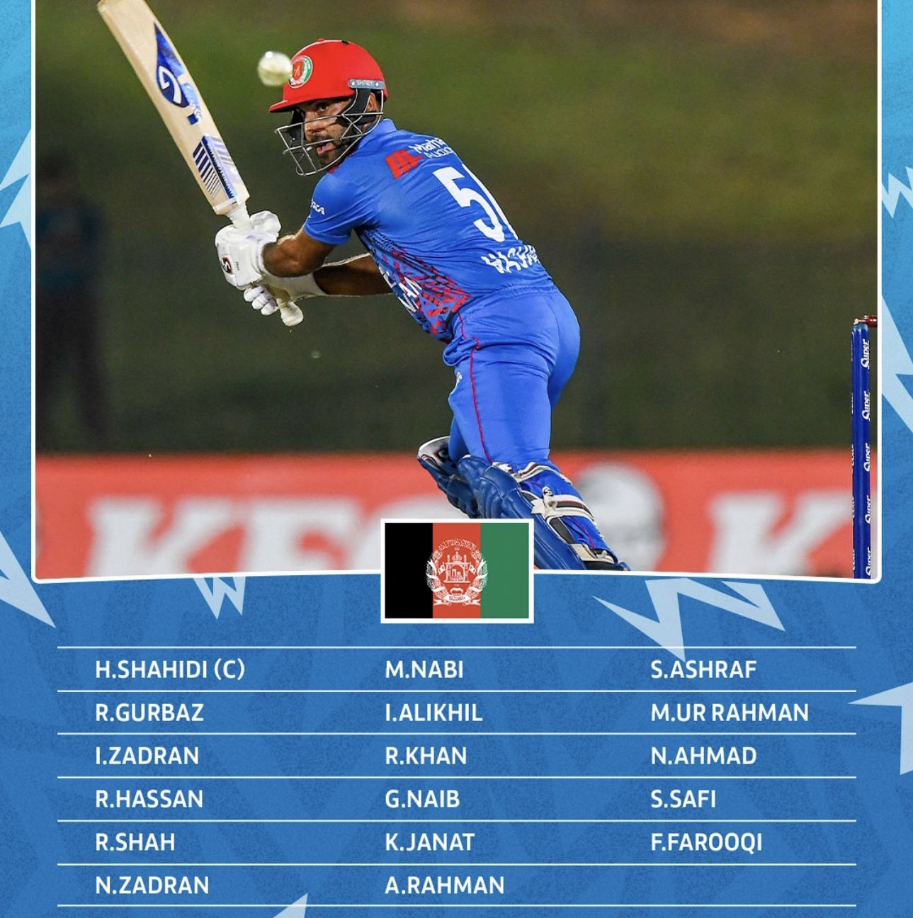 Afghanistan : Hashmatullah Shahidi (c), Rahmanullah Gurbaz (wk), Ibrahim Zadran, Riaz Hassan, Rahmat Shah, Najibullah Zadran, Mohammad Nabi, Ikram Alikhil, Rashid Khan, Gulbadin Naib, Karim Janat, Abdul Rahman, Sharafuddin Ashraf, Mujeeb Ur Rahman, Noor Ahmad, Mohammad Saleem Safi, Fazalhaq Farooqi