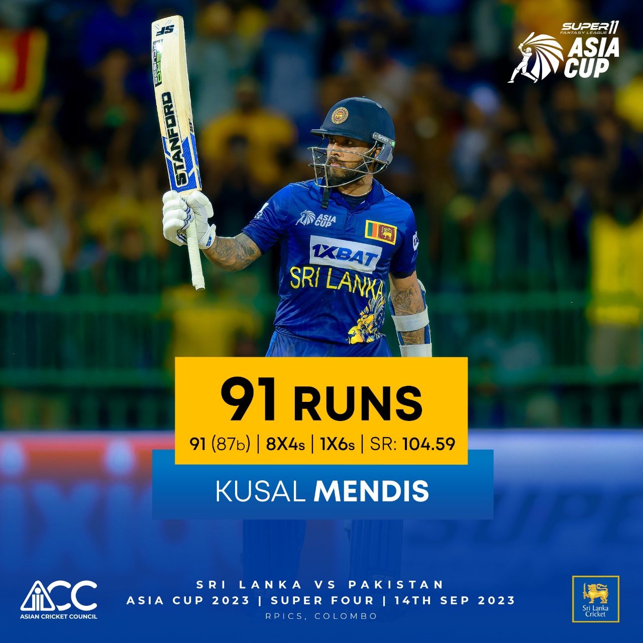 श्रीलंका के लिए सबसे ज्यादा 91 रन कुसल मेंडिस ने बनाए। असालंका ने नाबाद 49 रन बनाकर टीम को जीत दिलाई। समरविक्रमा ने भी 48 रन का योगदान दिया। पाकिस्तान के लिए इफ्तिखार अहमद ने तीन विकेट और शाहीन अफरीदी ने दो विकेट लिए। शादाब खान को एक विकेट मिला