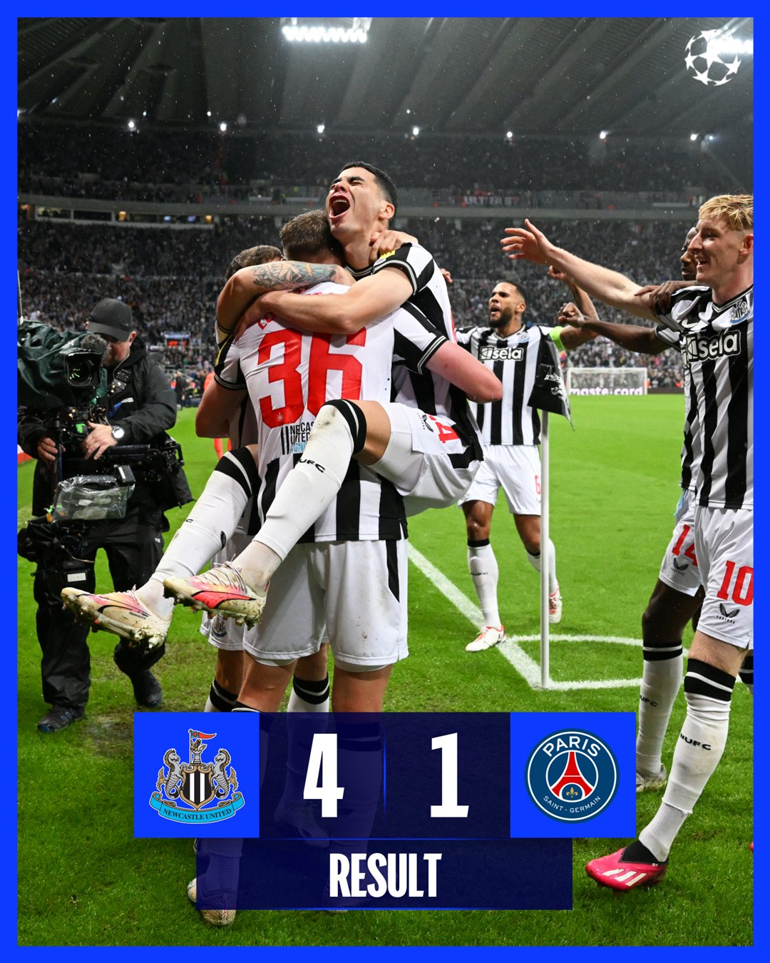 PSGके लिए एकमात्र गोल एल हर्नांडेज ने किया। Newcastle United  ने शानदार प्रदर्शन करते हुए बुधवार को 20 वर्षों में अपने पहले Champions League  घरेलू मैच में फ्रांस की Champions League  टीम Paris Saint Germain पर 4-1 से शानदार जीत हासिल की। न्यूकासल ने मिगुएल अल्मिरोन के गोल से 17 वें मिनट में बढ़त हासिल की, इसके बाद डैन बर्न ने ब्रेक से छह मिनट पहले हेडर के जरिए न्यूकासल की बढ़त को दोगुना कर दिया। सीन लॉन्गस्टाफ ने दूसरे हाफ में गोल कर अपनी टीम की जीत लगभग तय कर दी