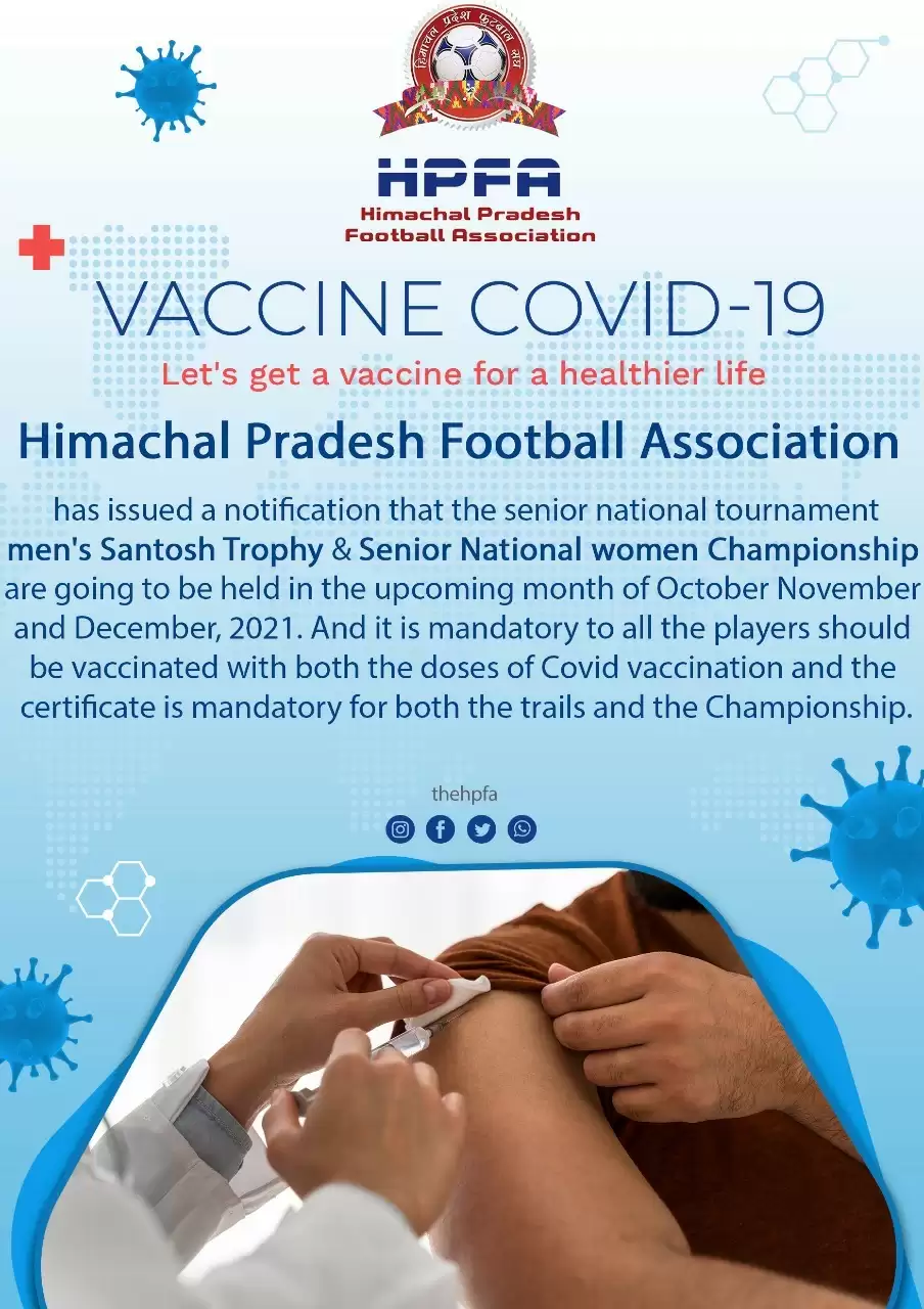 संघ द्वारा जारी पत्र में कहा गया है कि आने वाले दिनों में अखिल भारतीय फुटबॉल महासंघ द्वारा प्रस्तावित सीनियर नेशनल फुटबॉल चैंपियनशिप में भाग लेने वाले सभी प्रतिभागियों के लिए कोविड वैक्सीन की दोनों डोज लगाना अनिवार्य कर दिया गया है। इस प्रतियोगिता के लिए होने वाले ट्रायल में प्रतिभागी खिलाडिय़ों को वैक्सीन लगवाने का सर्टिफिकेट दिखाना अनिवार्य कर दिया गया है।