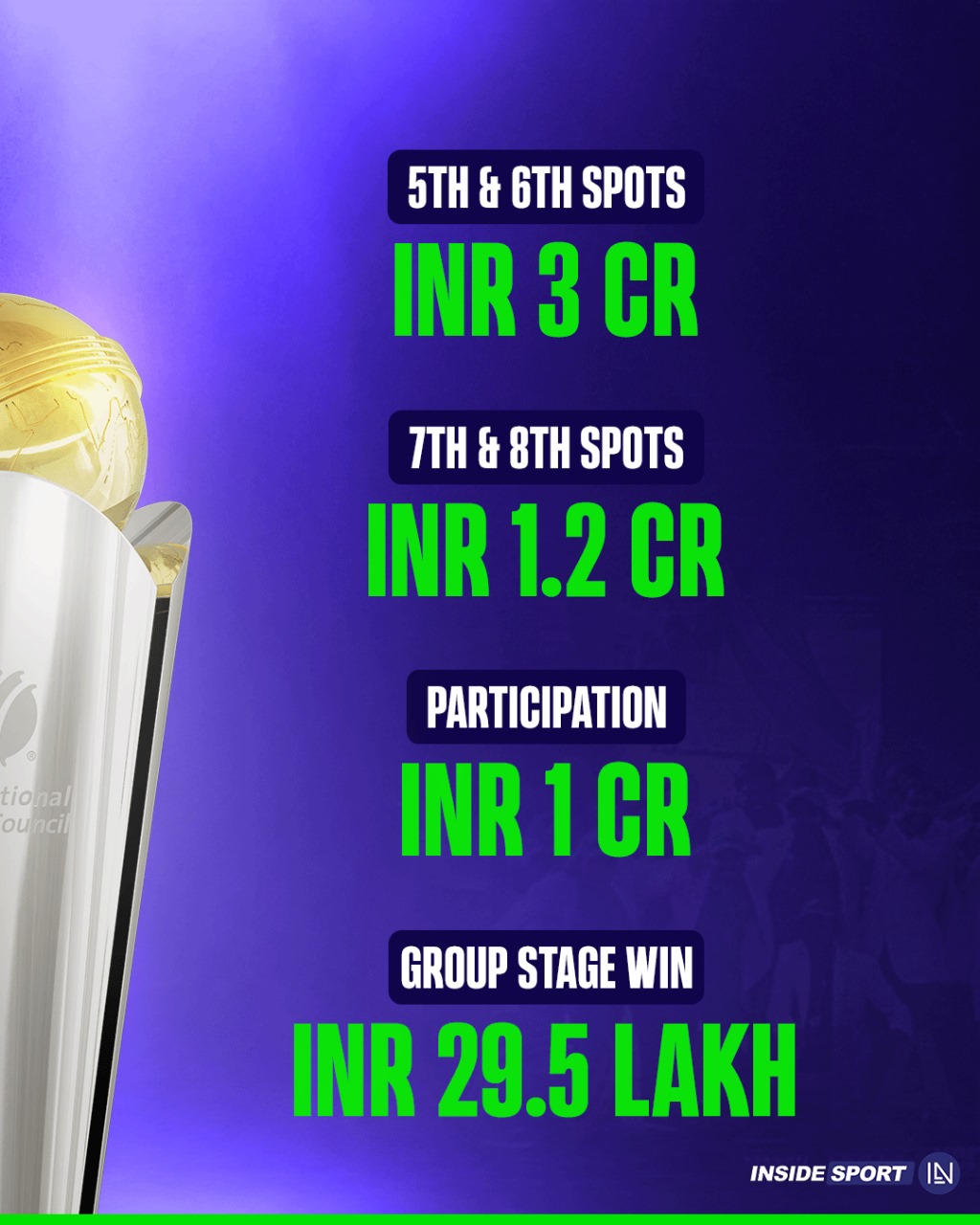 पांचवें या छठे स्थान पर रहने वाली टीम को 3.03 करोड़ रुपये का इनाम दिया जाएगा। वहीं सातवें और आठवें स्थान पर रहने वाली टीमों को 1.21 करोड़ मिलेंगे। इसके अतिरिक्त, सभी आठ टीमों को आयोजन में भाग ....लेने के लिए प्रत्येक को 1.08 करोड़ अतिरिक्त मिलेंगे। 1996 के बाद पाकिस्तान पहली बार किसी आईसीसी टूर्नामेंट की मेज़बानी कर रहा है।