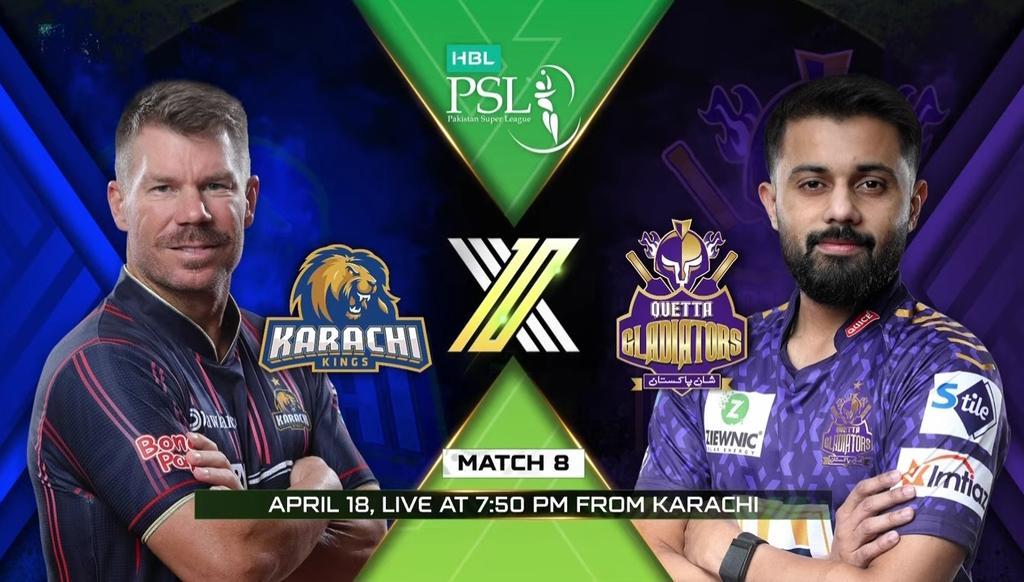 Karachi Kings vs Quetta Gladiators, 8th Match Pakistan Super League, 2025 : पाकिस्तान सुपर लीग 2025 का सातवां मैच कोटा ग्लडिएटर्स और कराची किंग्स के बीच नेशनल स्टेडियम कराची मेंआज यानि 18 अप्रैल को पाकिस्तानी टाइम के मुताबिक रात 8:00 बजे खेला जाएगा दोनों टीमों केबीच मैच खेले गए जायेगे |