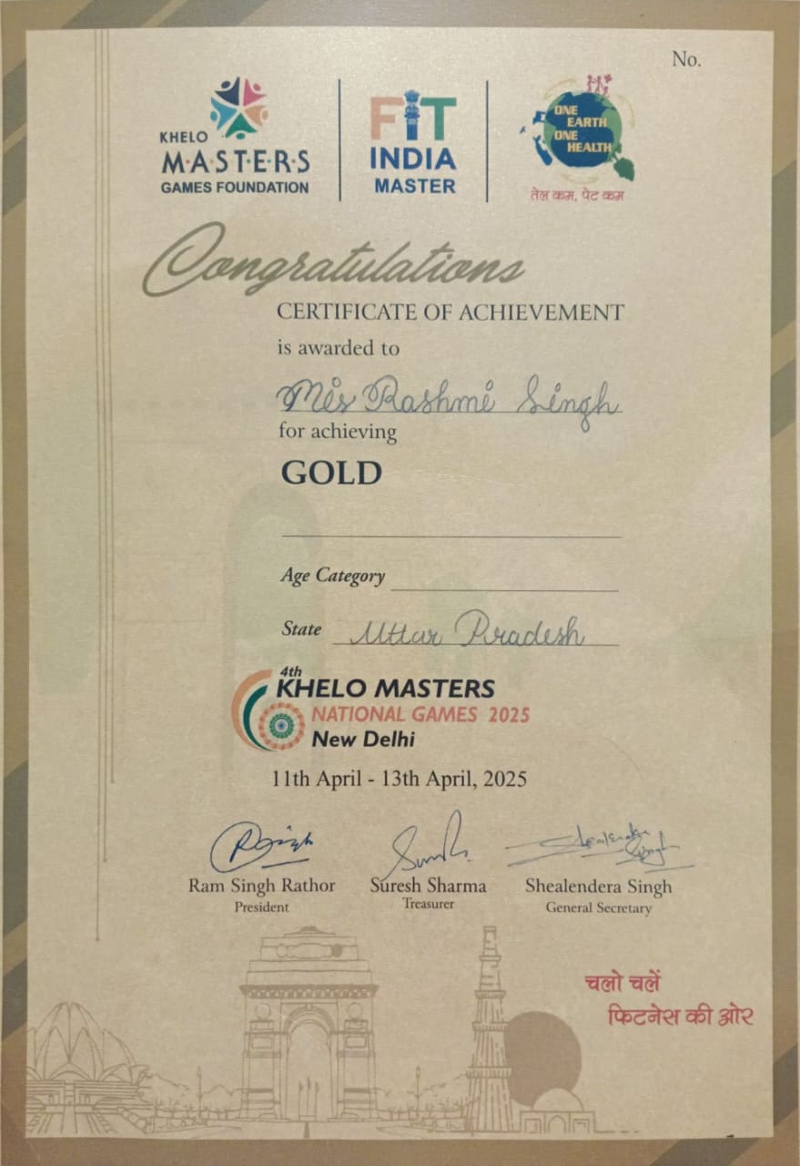 रश्मि सिंह यूपी टीम की ओर से हॉकी खेल रही थी। खेलो मास्टर्स गेम 2025 की नेशनल हाकी प्रतियोगिता दिल्ली में आयोजित की गई थी। इस प्रतियोगिता में 30 वर्ष से अधिक उम्र के नेशनल और इंटरनेशनल खिलाड़ी शामिल हुए थे। बलरामपुर की रश्मि सिंह को यूपी टीम के लिए चुना गया था। दिल्ली में आयोजित इस प्रतियोगिता में हरियाणा,हिमाचल प्रदेश,उत्तराखंड,मध्य प्रदेश,तमिलनाडु,पंजाब और दिल्ली की टीमों ने हिस्सा लिया था।
